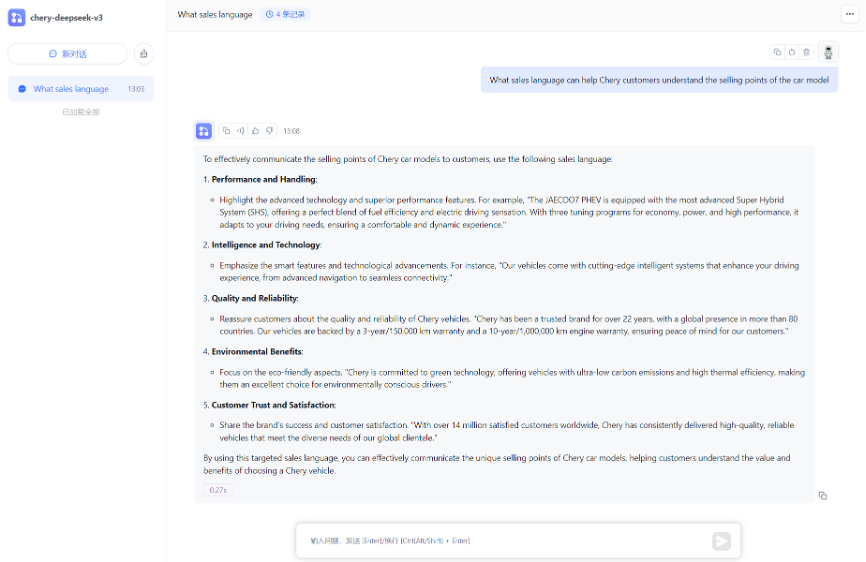 Los robots Chery Aimoga ya han integrado los modelos de código abierto V2, V3 y R1 de DeepSeek en su plataforma de nube robótica. Estos modelos impulsan los sistemas de interacción de los robots de marketing de la tienda Chery 4S. El equipo de I+D de Chery Aimoga expresó su entusiasmo por profundizar la colaboración con DeepSeek y otras empresas líderes en inteligencia artificial en ámbitos más amplios. Su objetivo es ampliar continuamente los límites de las aplicaciones robóticas, abriendo nuevas posibilidades de innovación.