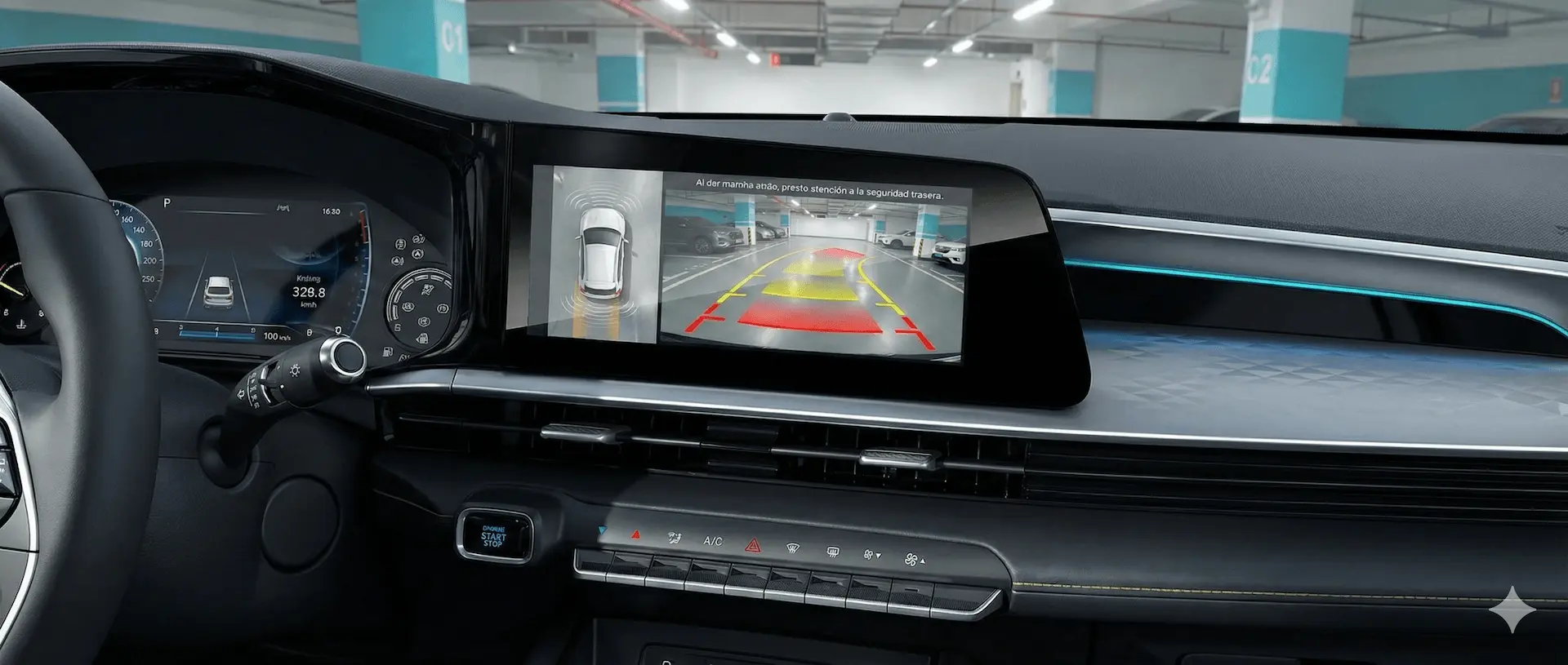 Cámara de visión trasera con guías dinámicas y sensores de retroceso que facilitan estacionar y maniobrar con seguridad.